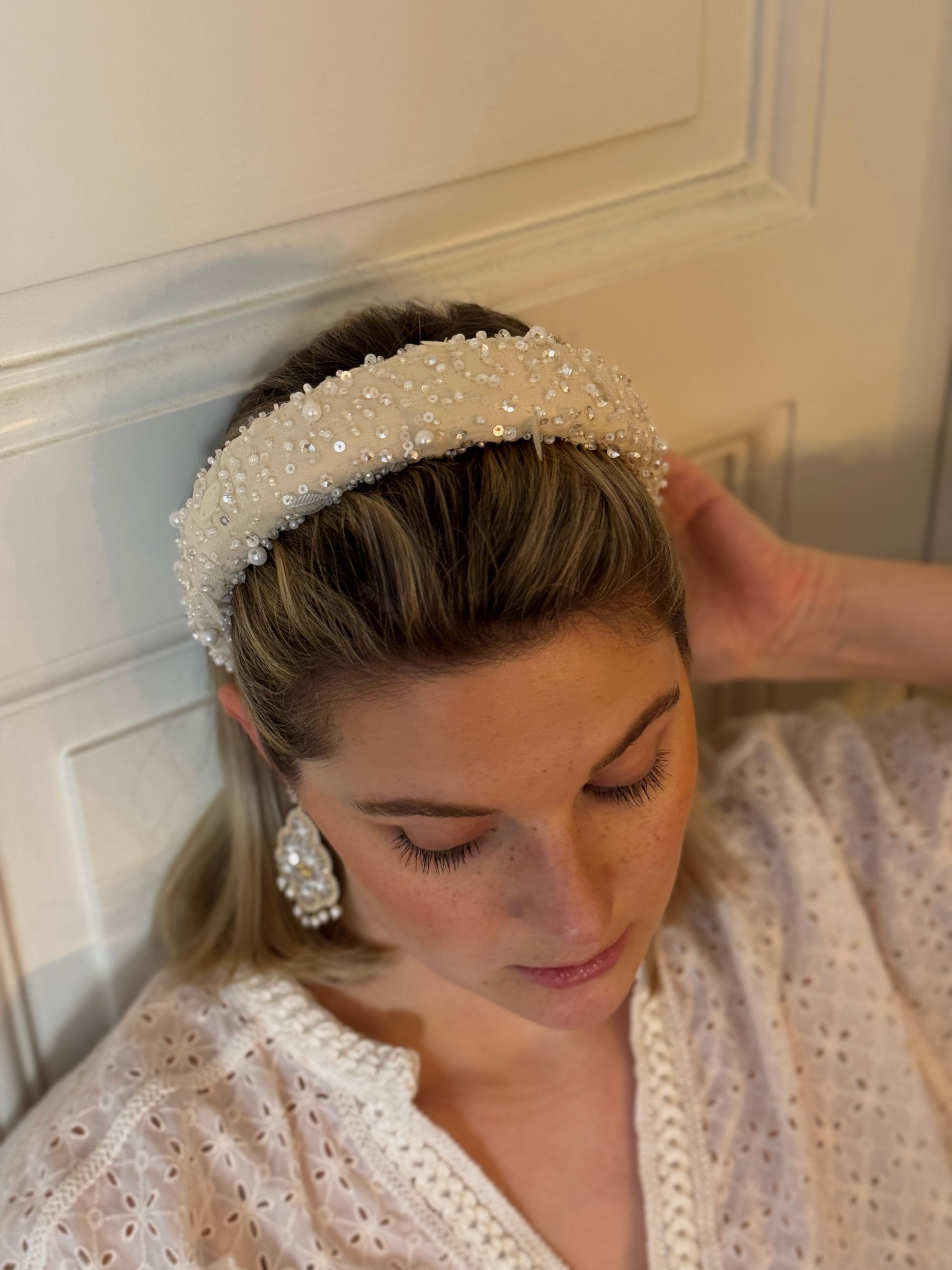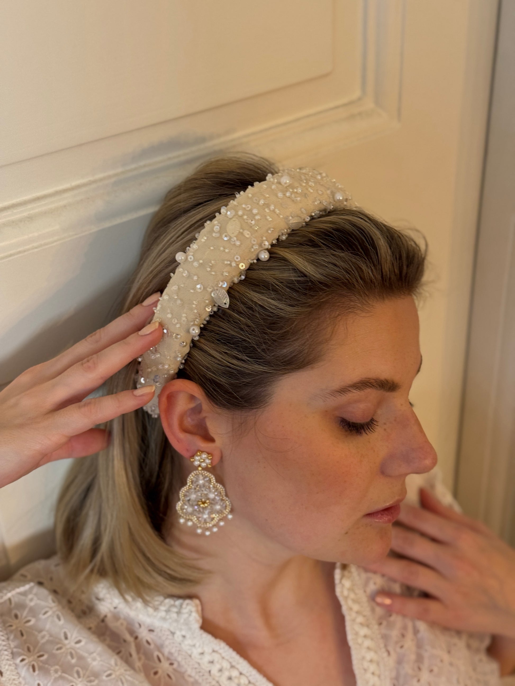 Dieser handgemachte luxuriöse Haarreifen vereint Stil und Handwerkskunst auf unvergleichliche Weise. Der cremefarbene Stoff ist kunstvoll mit funkelnden Pailletten und zarten Perlen verziert, die jedem Outfit eine glamouröse Note verleihen.